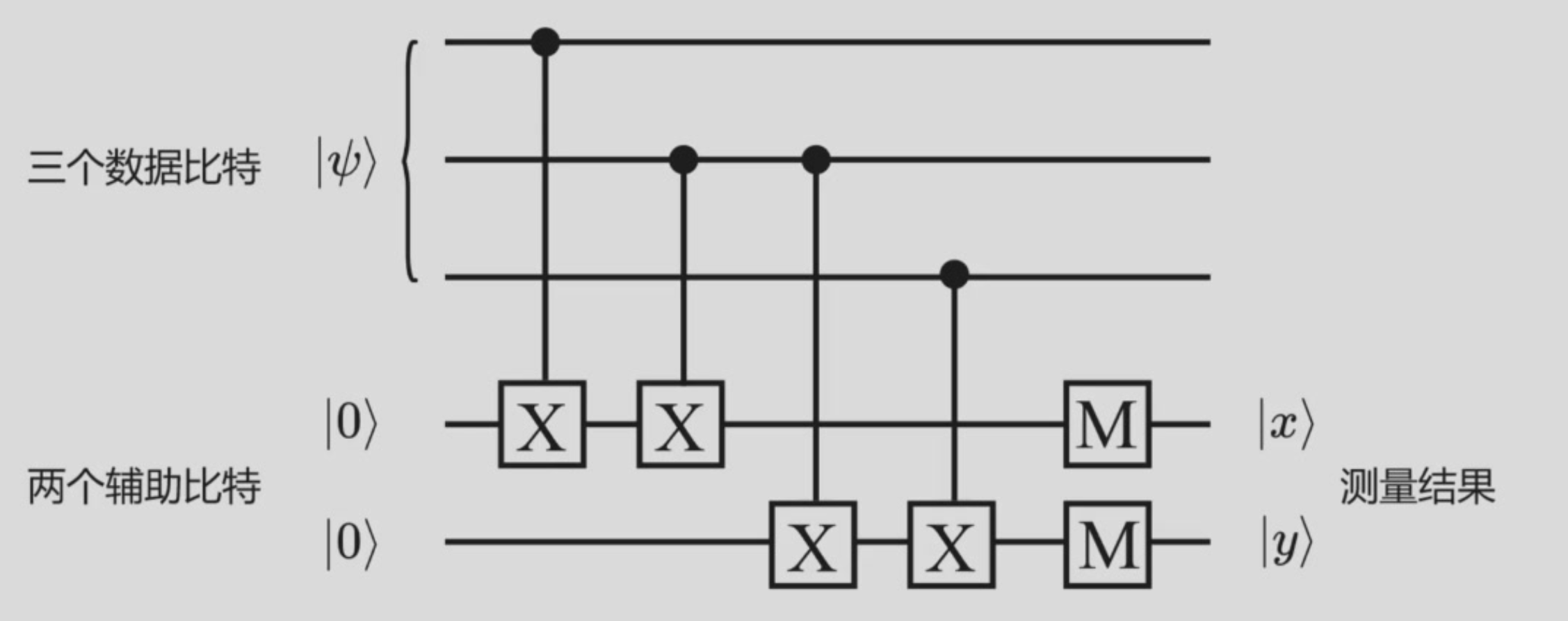 数据比特1发生X错误,初始态变为\(\alpha\ket{100}\beta\ket{011}\)\(\ket{x}=\ket{1},\ket{y}=\ket{0}\)