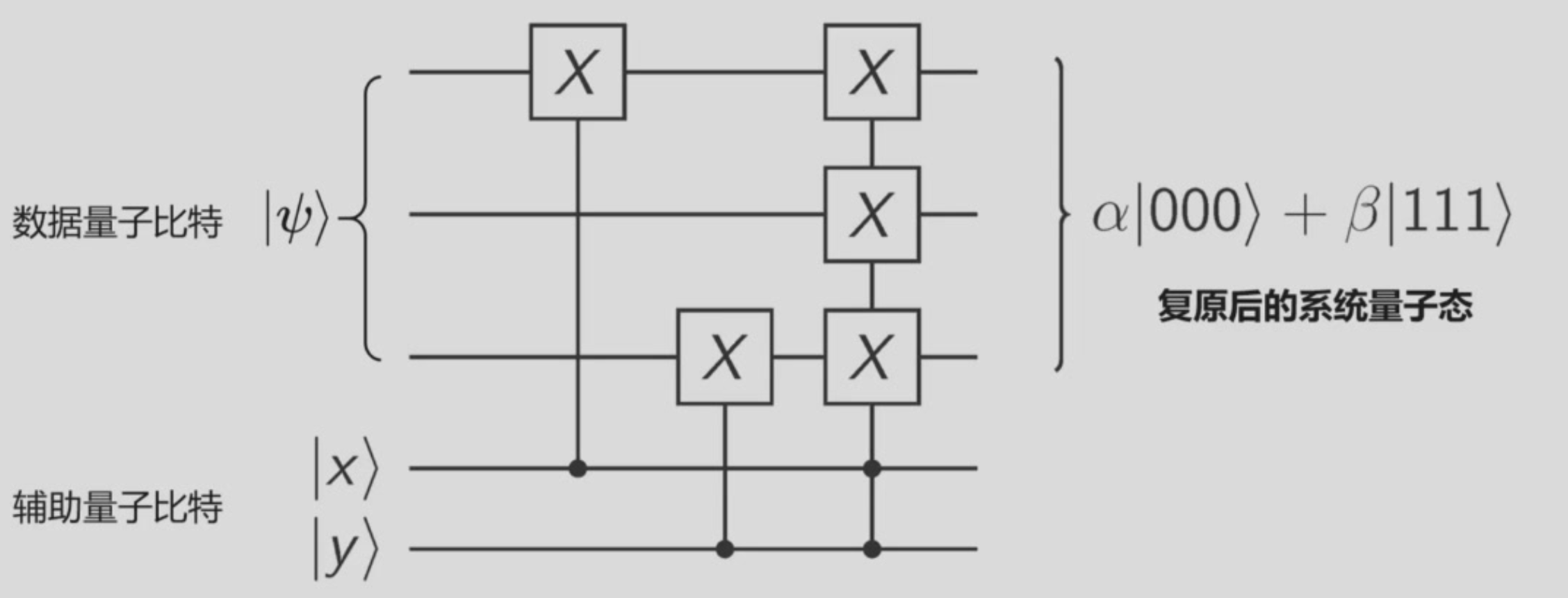 \(\ket{\psi}\equiv\alpha\ket{000}+\beta\ket{111}\),通过\(\alpha\ket{000}+\beta\ket{100}\)分别经过第二第三比特的控制X门(CNOT)得到