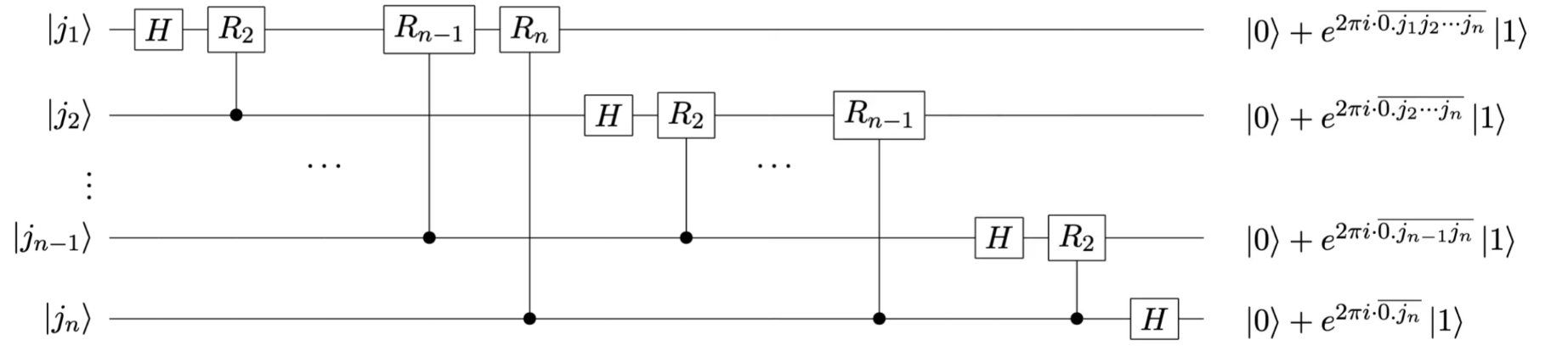 再经过一个\(R_2\)门,\(\frac{1}{\sqrt{2}}(\ket{0}+e^{2\pi i\overline{0.j_1j_2}}\ket{1})\ket{\overline{j_2...j_n}}\)